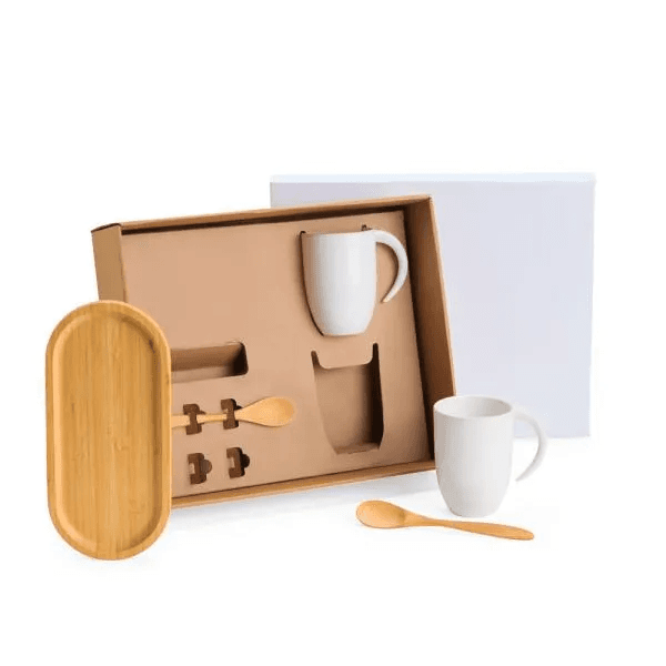 Kit para Café/Chá. Composto por bandeja oval e duas colheres de 18 cm em Bambu; duas canecas em cerâmica branca com 350 ml cada uma.