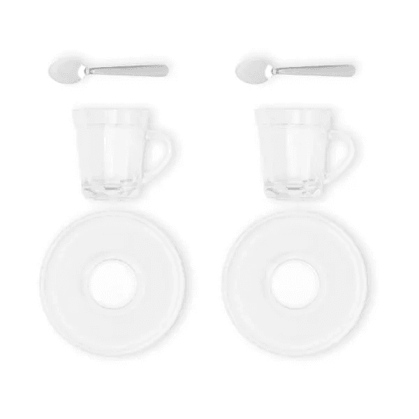 Composto por duas xícaras express americano com pires em vidro e duas colheres em Inox.