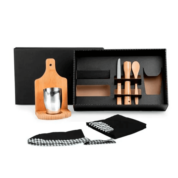 Kit Caipirinha contendo tábua, pilão, colher de 18cm e base para a tábua em Bambu; faca 4" para frutas em Madeira/Inox; copo em Aço Inox, touca e avental com bolso em Brim preto. Acomodados em uma linda caixa para presente. Capacidade da copo: 350ml