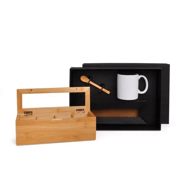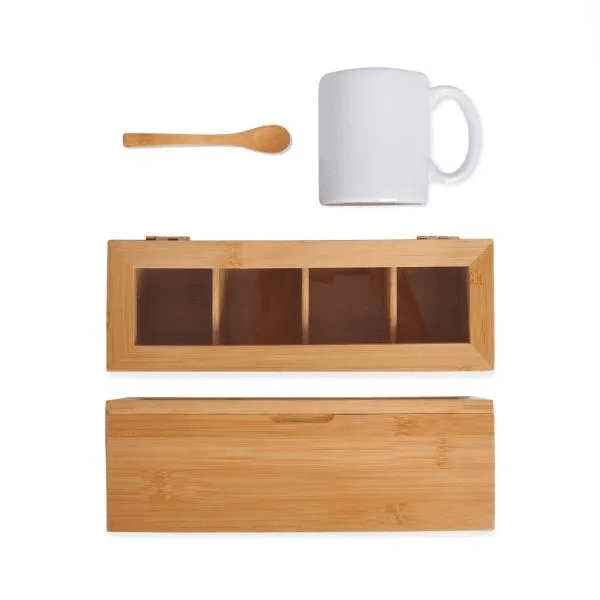 Composto por Caixa para chás em Bambu/Poliestireno; colher de 13 cm em Bambu e caneca em cerâmica branca. Não acompanha chás.