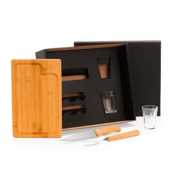 Composto por tábua para Churrasco/Cozinha em Bambu; faca e garfo em Madeira/Inox e dois copos americanos em vidro.