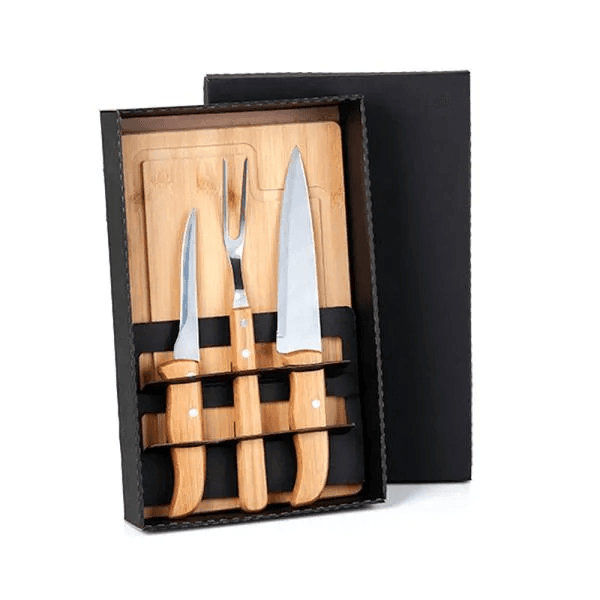Conjunto para Churrasco. Composto por tábua em Bambu com sulco; faca 7'' em Bambu/Inox; faca 5" para desossar e garfo trinchante em Madeira/Inox. Acomodados em uma linda caixa para presente. Como cortesia, na faca 7" fazemos uma gravação com os cortes do boi.