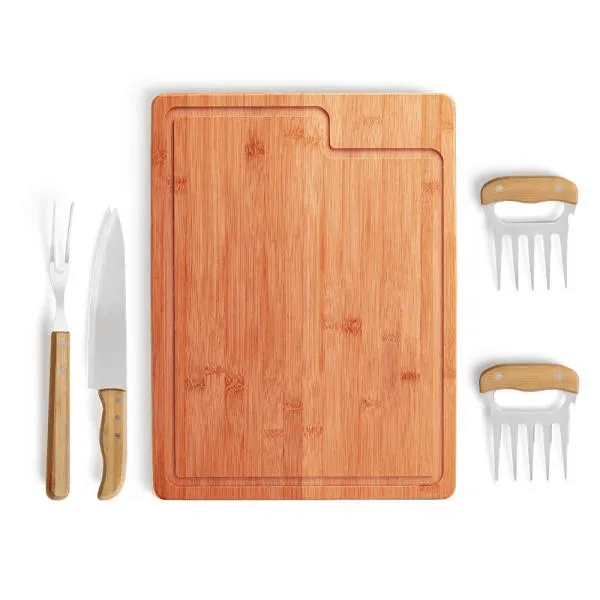 Kit para Churrasco em Bambu/Madeira/Inox. Composto por tábua em Bambu; garfo trinchante, faca 8'' e dois garfos de 5 dentes com abridor de garrafa em Madeira/Inox.