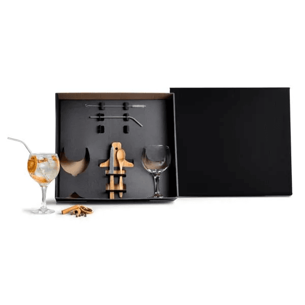 Kit completo para gin tônica composto por tábua e colher de 18 cm em Bambu; faca 4" para frutas em Madeiras/Inox; duas taças em vidro; canudo e limpador em aço Inox.