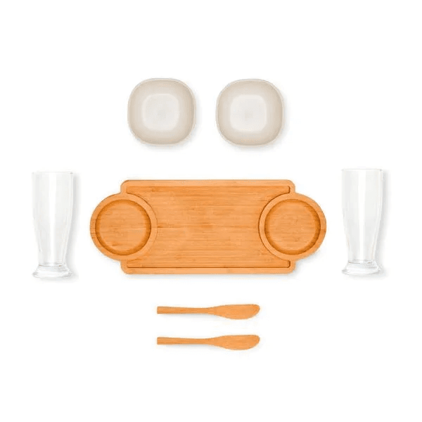 Composto por petisqueira com base em Bambu e dois potes em Fibra de Bambu; dois copos em vidro para Cerveja/Drinks; duas espátulas de 14 cm em Bambu e espaço para garrafa (NÃO ACOMPANHA GARRAFA).