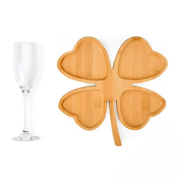 Kit para petisco e champanhe. Conta com petisqueira formato de trevo em bambu; Taça para champanhe em vidro; Espaço para garrafa com palha (NÃO ACOMPANHA GARRAFA). Estão perfeitamente acomodados em uma caixa para presentear.