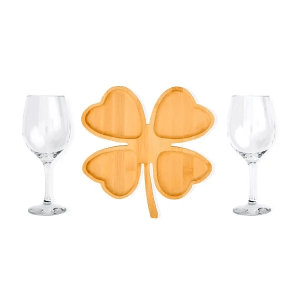 Kit para petisco e vinho. Conta com petisqueira em formato de trevo em bambu; Duas taças para vinho em vidro; Espaço para garrafa com palha (NÃO ACOMPANHA GARRAFA). Estão perfeitamente acomodados em uma caixa para presentear.