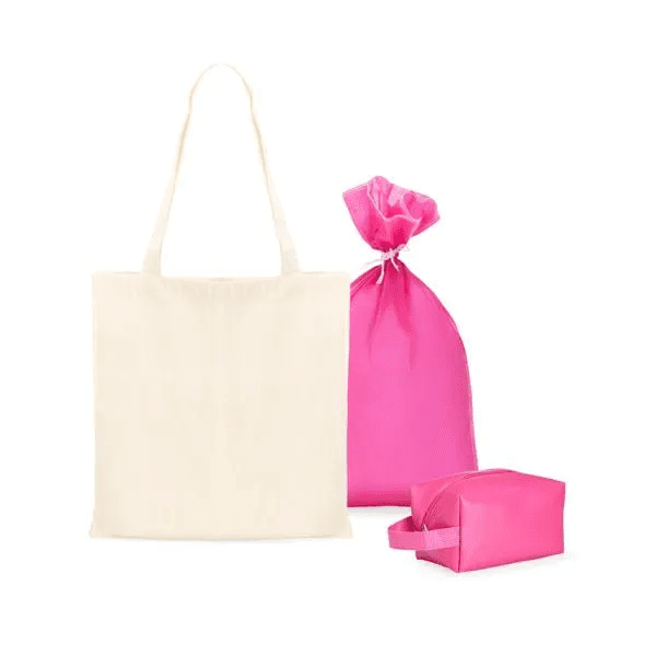 Kit sacola e necessaire. Composto por sacola de algodão com alças de 60cm e necessaire com alça em material sintético na cor rosa.