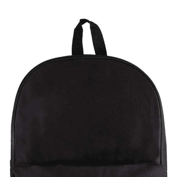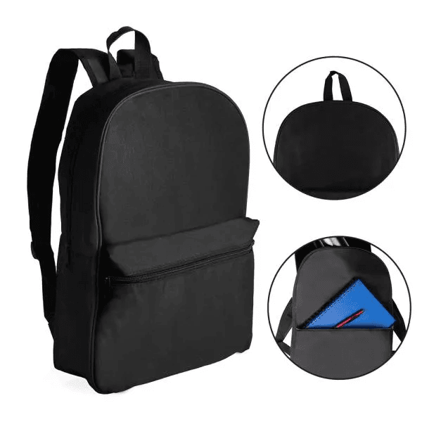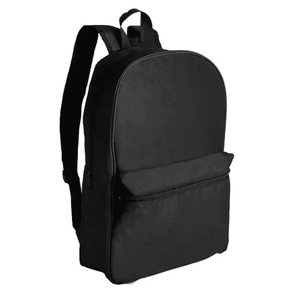 Mochila preta confeccionada em Polyester 600D. Conta com bolso principal e bolso frontal em zíper horizontal, alças ajustáveis e alça de mão.