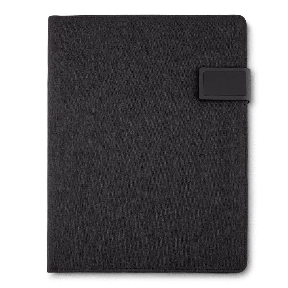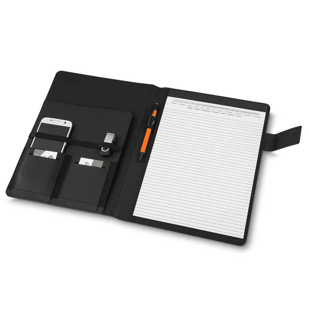 Pasta executiva com bloco de anotações, suporte para celular, caneta, porta cartões, capa com material sintético, 20 folhas (27x21cm) com Fechadura Magnética.