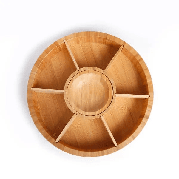 Petisqueira giratória em bambu. Conta com seis divisórias, com placas removíveis, e um bowl para molhos e patês.