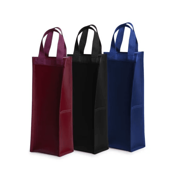 Porta vinho em Corvim preto para 1 garrafa com alças e bolso lateral.