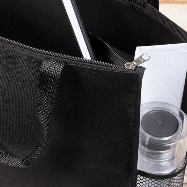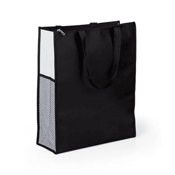 Sacola de mão em nylon 600 preta/branca. Conta com alça, tela lateral, compartimento duplo, sendo um com fechamento em zíper.
