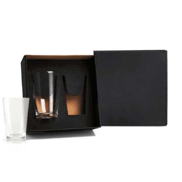 Conjunto composto por dois copos em vidro de 350ml, perfeitamente acomodados em uma caixa kraft com tampa.