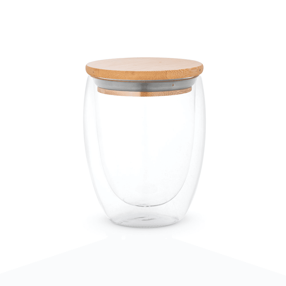 94766 ECUADOR M. Copo em vidro isotérmico (borossilicato), térmico com parede dupla isolada a ar e tampa de bambu 250 mL