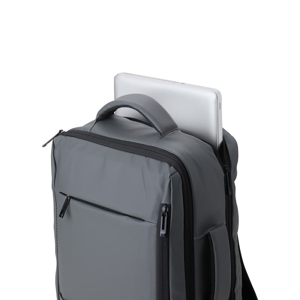 Mochila em couro sintético 23 litros resistente à água com quatro compartimentos, sendo o principal com bolso para notebook 15,6 e tablet 10. Com divisórias internas para acessórios, a mochila possui suporte externo usb, alça para encaixe em malas de viagem e duas alças de mãos, sendo uma delas lateral para o transporte da mochila no modo pasta.