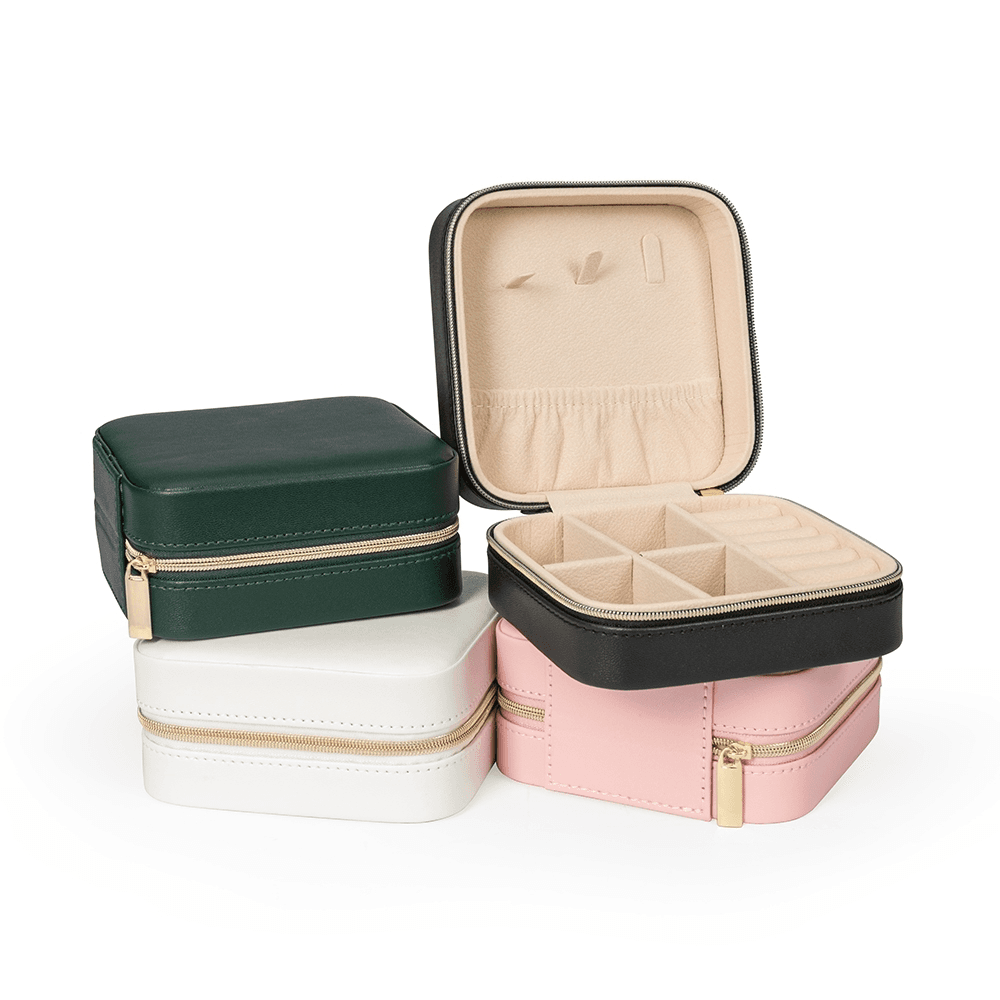 Este porta-joias em couro sintético é uma opção compacta para armazenar objetos menores com segurança. Possui revestimento interno com textura macia e fechamento em zíper, além de três mini ganchos, um bolso com elástico, uma divisória removível com quatro quadrantes e um compartimento estofado com ranhuras.