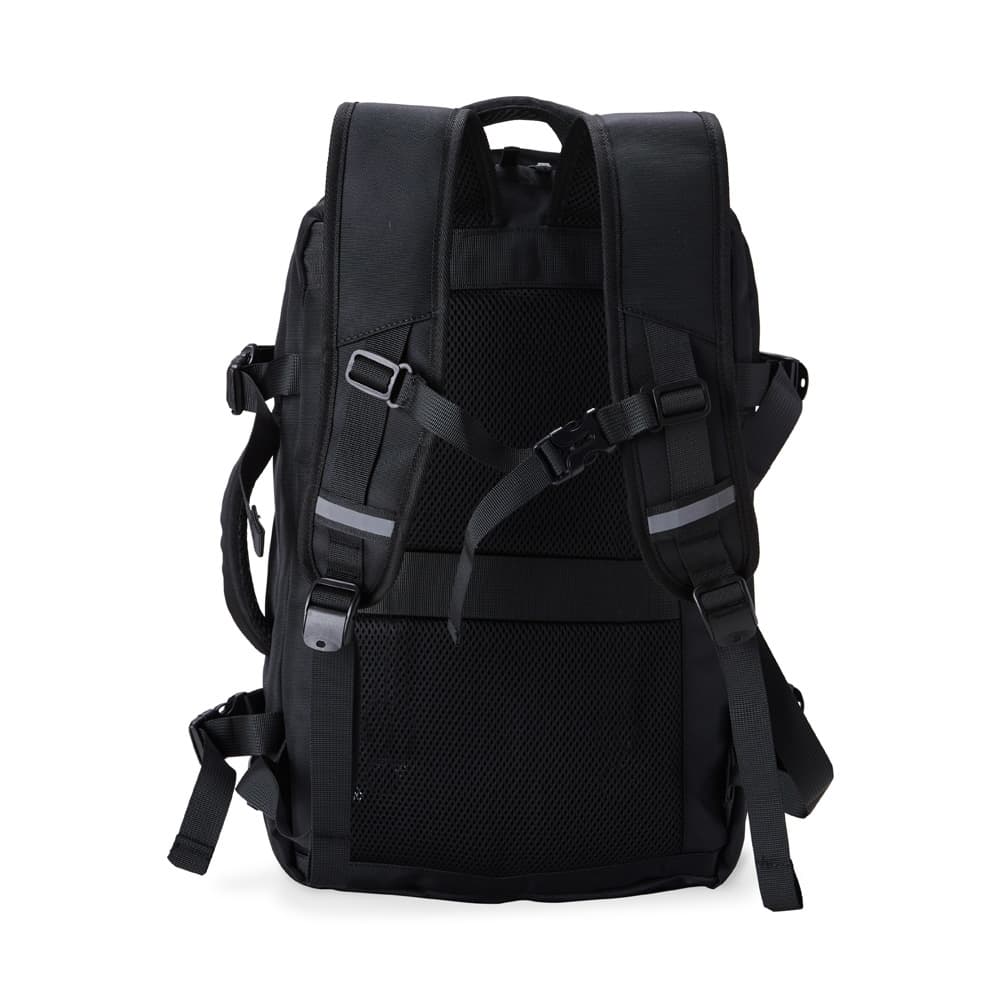 Mochila de nylon 20 litros com quatro compartimentos, sendo o principal com bolso para notebook 15,6 e tablet 12,4. Com divisórias internas para acessórios e porta chave, a mochila possui adaptador USB externo, alça para encaixe em malas de viagem, alças de compensação, duas alças de mãos, área costada com revestimento espumado e alças para as costas com faixas refletivas e revestimento espumado.