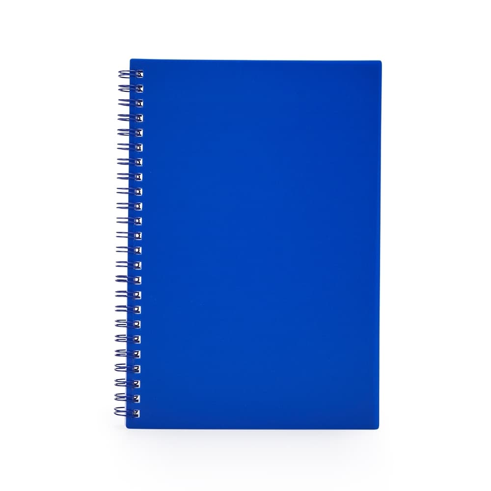 Caderno A5 plástico com wire-o metálico. Capa em PP, contém aproximadamente 80 folhas brancas com pauta.