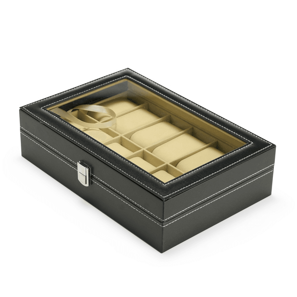 Porta-relógios com acabamento em couro sintético à base de PVC e revestimento interno em veludo. Conta com 12 compartimentos fixos com almofadas removíveis em espuma, além de visor feito em vidro e trava de segurança para fechamento do estojo.