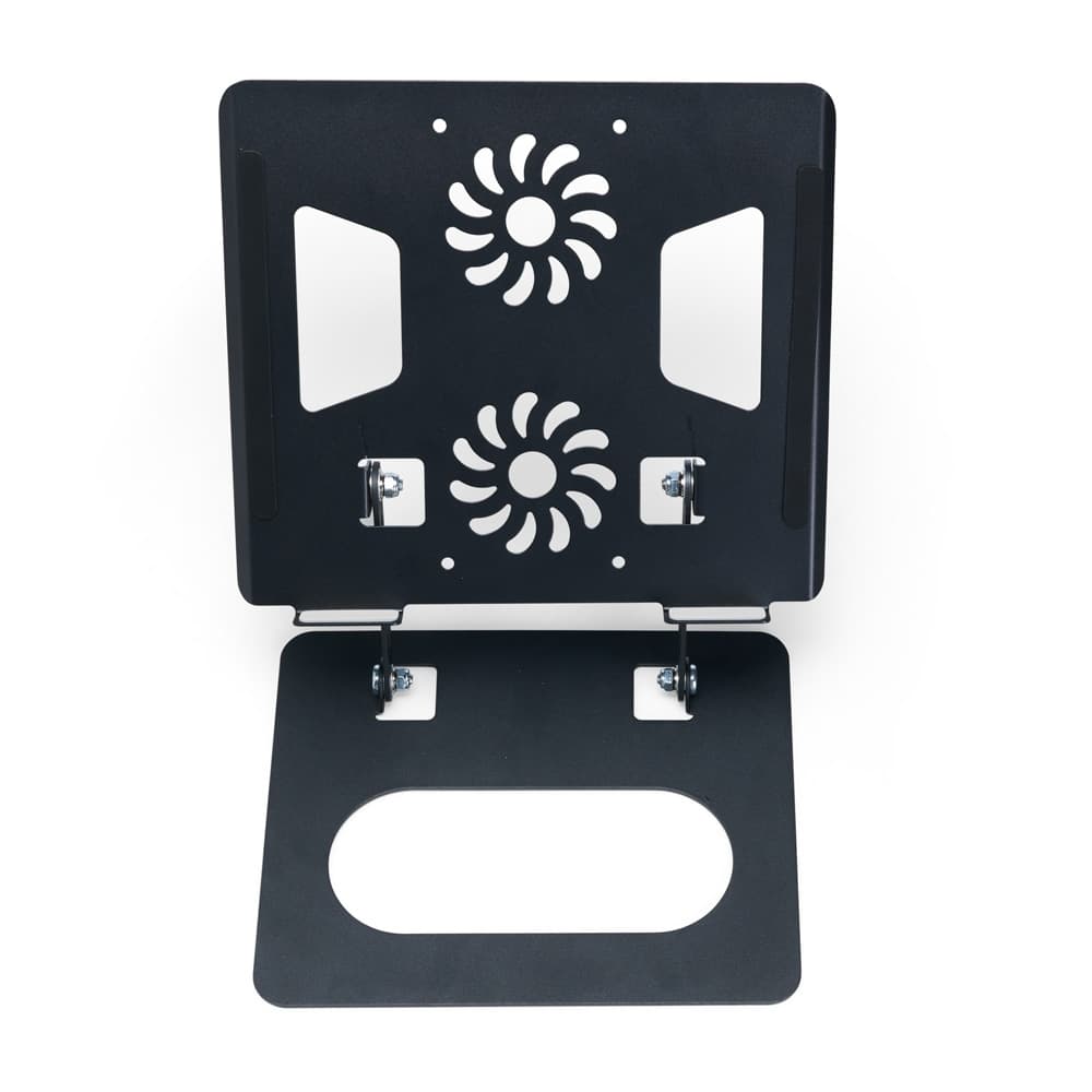 Suporte articulado para notebooks com ajuste em diversos ângulos para alcançar uma melhor posição de uso do aparelho com mais conforto e ergonomia nos mais variados ambientes, como escola, trabalho ou em casa. A construção funcional em aço do suporte e suas aberturas nas laterais e no centro ajudam na dissipação de calor do aparelho aliada com as tiras antiderrapantes nas laterais e nas bordas inferiores garantem um uso mais seguro e estável do eletrônico.