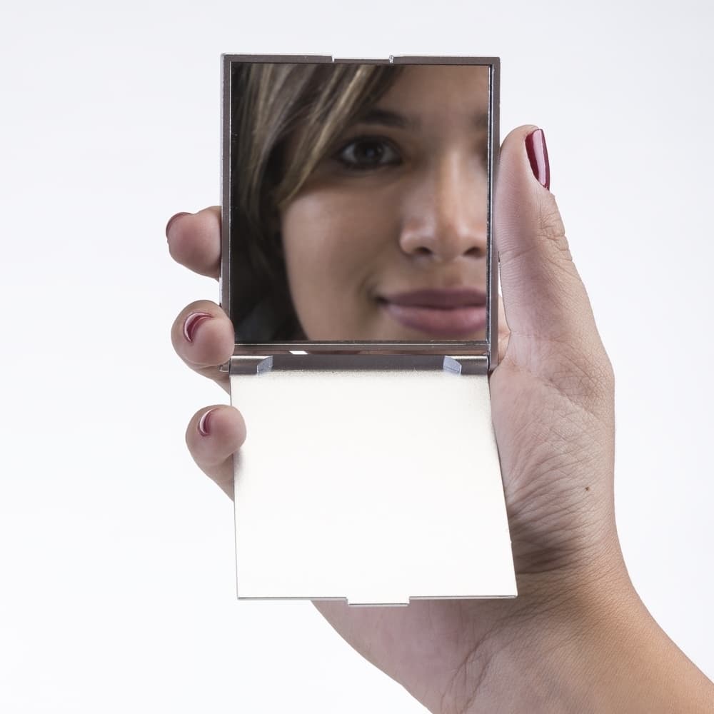Um espelho no tamanho certo para estar sempre pronto para uso em qualquer situação. Com moldura feita inteiramente em plástico liso resistente, este espelho de vidro sem aumento traz uma tampa protetora que pode ser usada como um apoio para mantê-lo de pé em uma superfície plana quando inclinada para trás. Seu tamanho e formato garantem mais praticidade para carregar o espelho em bolsos, mochilas, sacolas, bolsas e nécessaires.