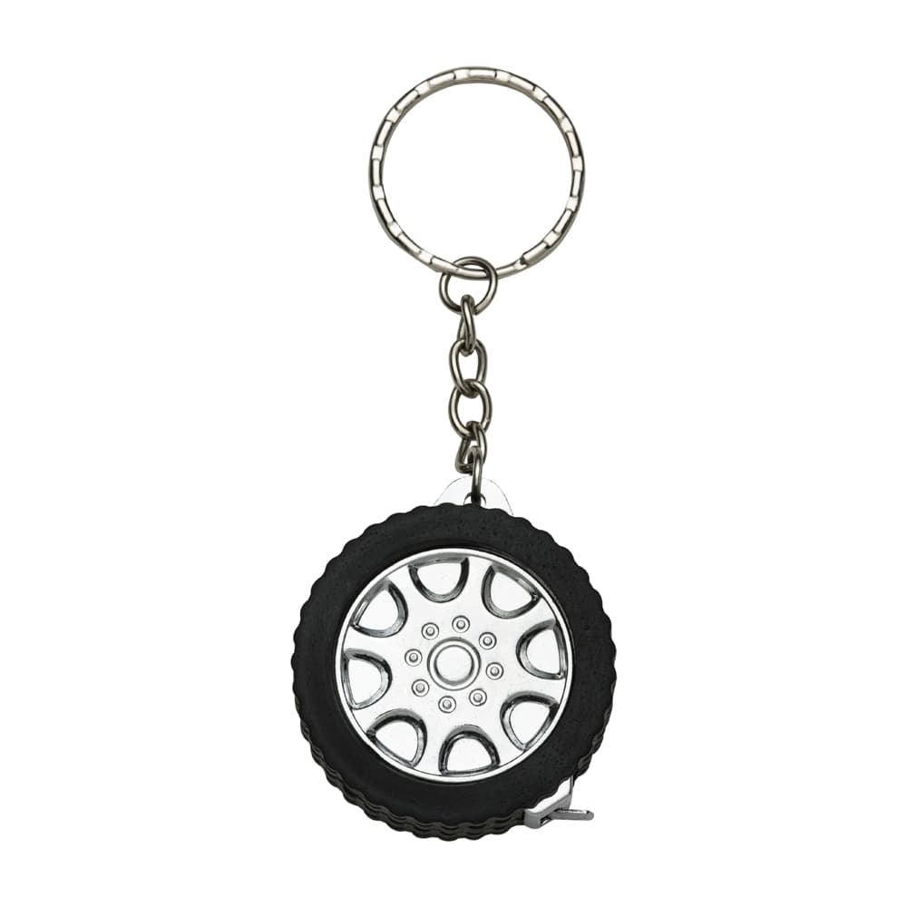 Um chaveiro em plástico com argola em metal para agradar quem gosta de tudo sob medida. Com design característico em forma de pneu de carro, incluindo detalhes prateados representando a roda, o chaveiro traz uma trena com fita em aço com o alcance máximo de 1 metro e também exibe suas medidas em pés e polegadas, o que a torna um item versátil para fazer medições no dia a dia.