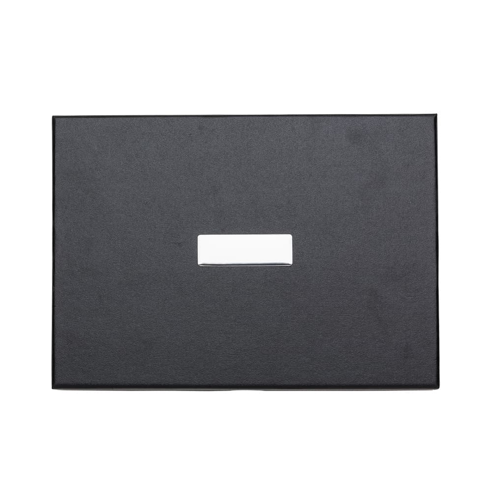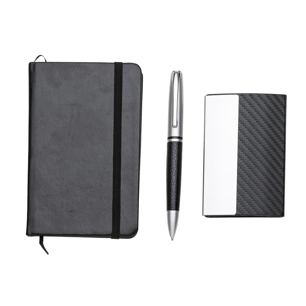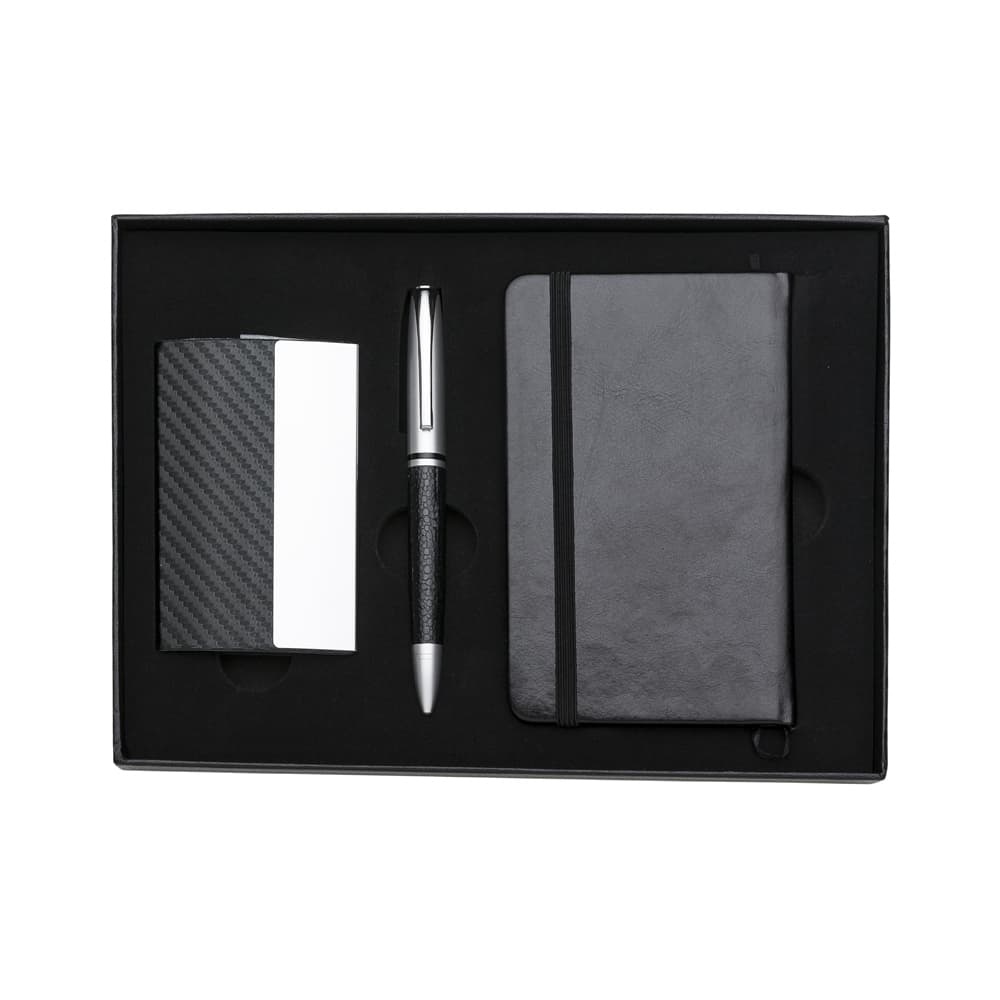 Kit executivo 3 peças em estojo de papelão com tampa e parte interna revestida de espuma. Contém: porta cartão de couro sintético texturizado com detalhes prata brilhante, caneta metal fosca com detalhe emborrachado preto, caderneta em couro sintético com aproximadamente 80 folhas amarelas pautadas. Acompanha placa metálica para gravação.