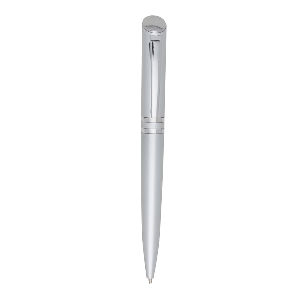 Caneta plástica com carga esferográfica azul 1.0 mm e acionamento por rotação.