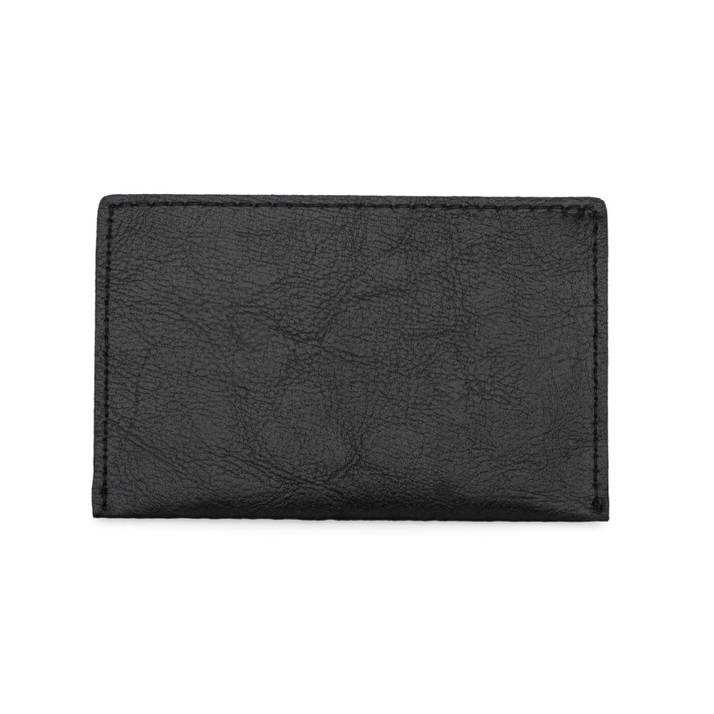 Porta cartão em couro sintético com duas divisórias frontais, verso liso.