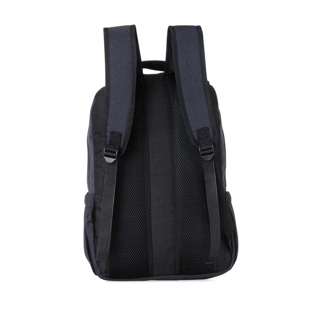 Mochila poliéster com compartimento para notebook. Possui um compartimento superior com bolso interno para notebook, segundo compartimento superior com divisórias internas para documentos e bolso de tela além de um saída interna para fones de ouvido e dois bolsos nas laterais. Alça de mão, alças ajustáveis para as costas revestidas com espuma e parte traseira também revestida com espuma para um maior conforto.