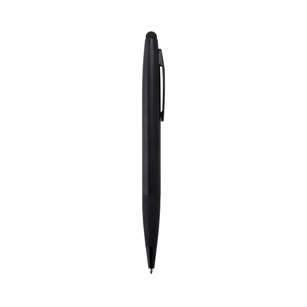 Caneta metálica com touchscreen, carga esferográfica azul 1.0mm e acionamento por rotação.