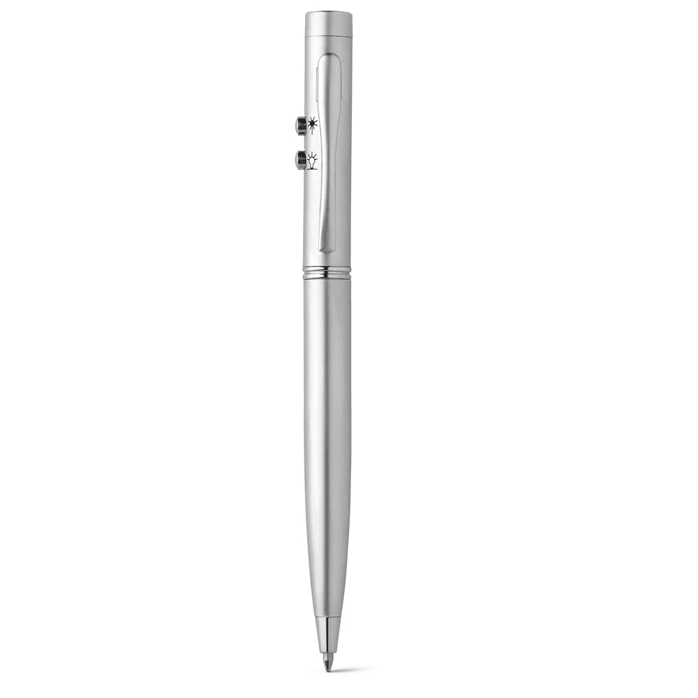 91821 EBRE. Esferográfica em metal com ponteira laser, LED e escrita em azul