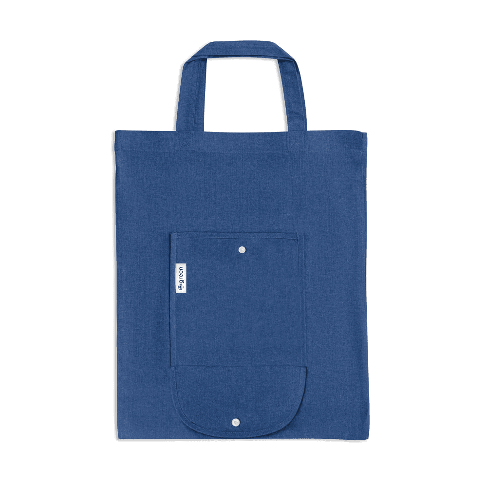 Sacola dobrável em 50% algodão, 30% algodão reciclado e 20% poliéster reciclado (140 g/m²), com alças de 38 cm. Aberto: 380 x 470 mm | Dobrado: 135 x 205 mm