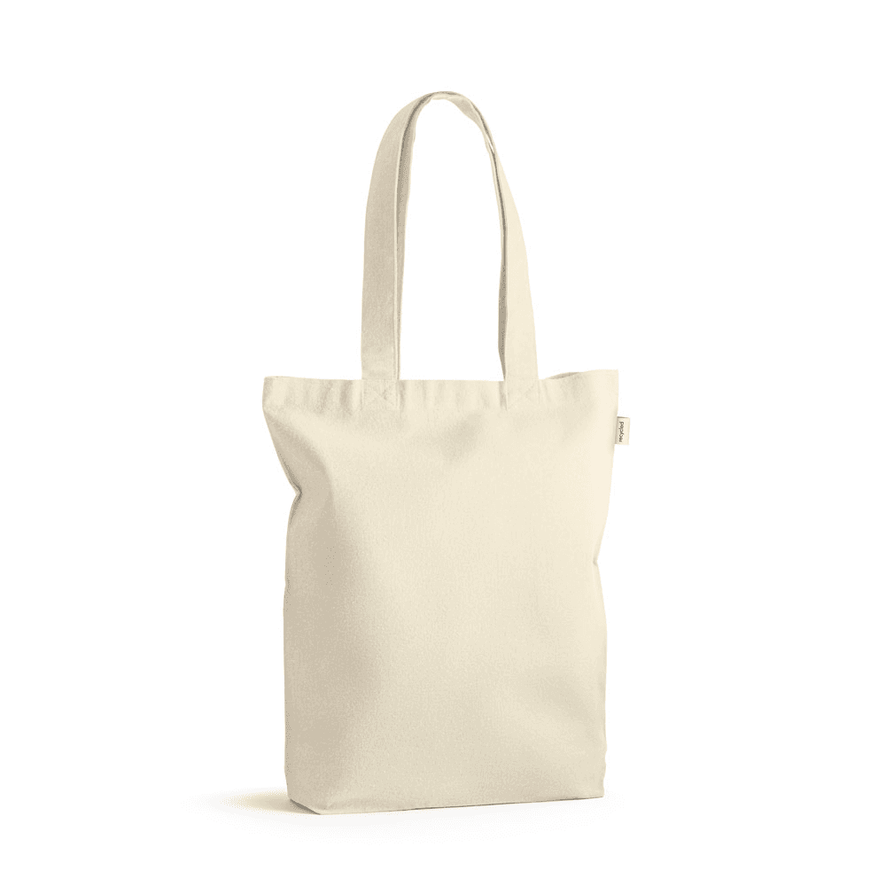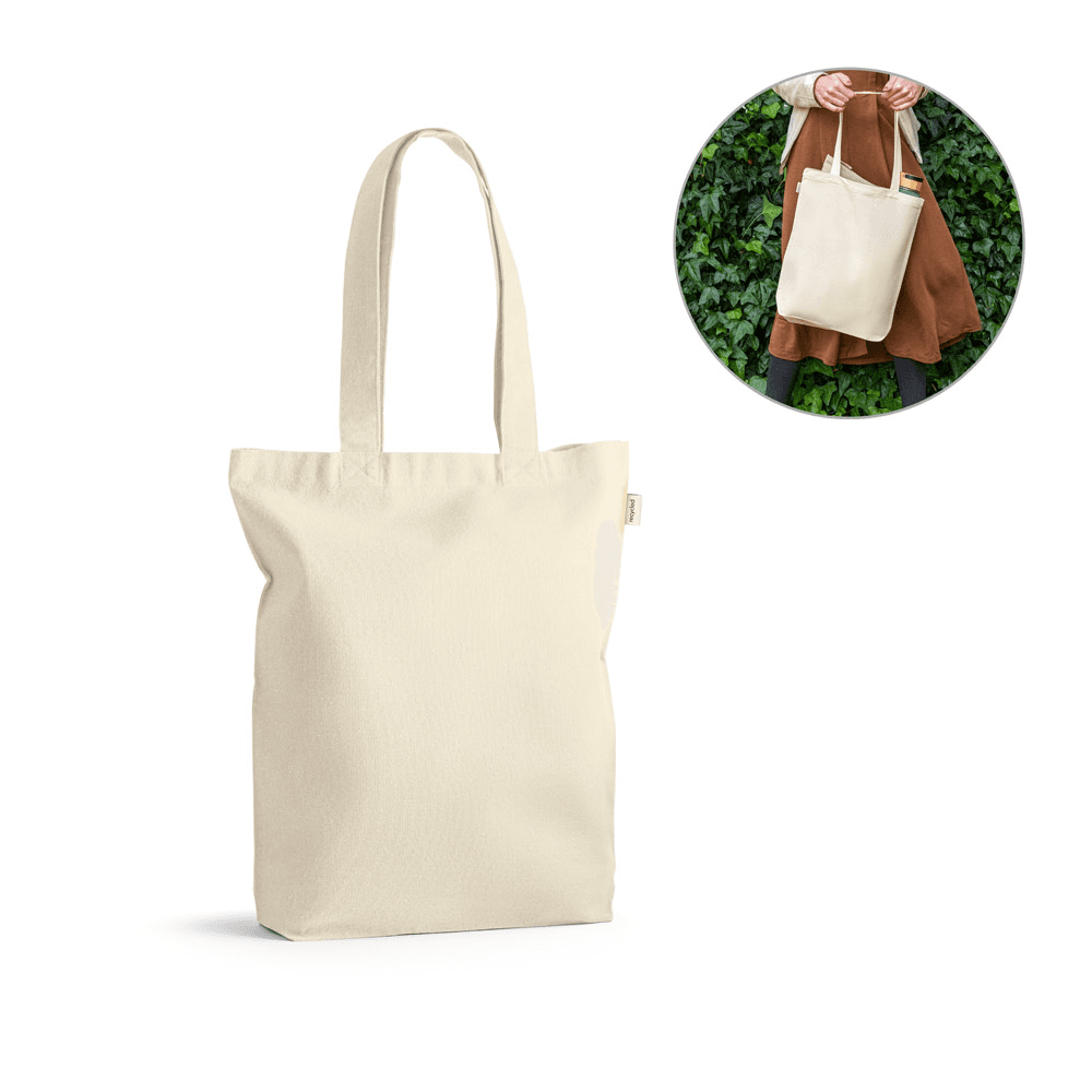 Sacola em 100% algodão reciclado (220 g/m²) com alças de 65 cm. 380 x 420 x 100 mm