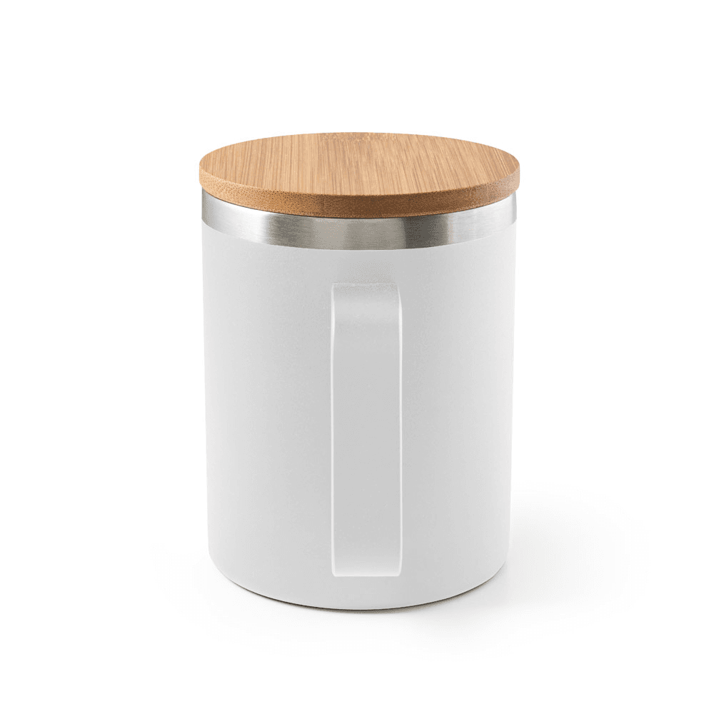 Copo de viagem em aço inox 90% reciclado, térmico com parede dupla isolada a vácuo e tampa em bambu. Esta caneca tem um revestimento em pó que lhe confere mais durabilidade e resistência. Capacidade até 420 mL. Fornecido em caixa presente de papel kraft reciclado. Certificação EU Food Grade. A cor e o resultado da impressão nos materiais naturais pode variar entre produtos. ø88 x 112 mm