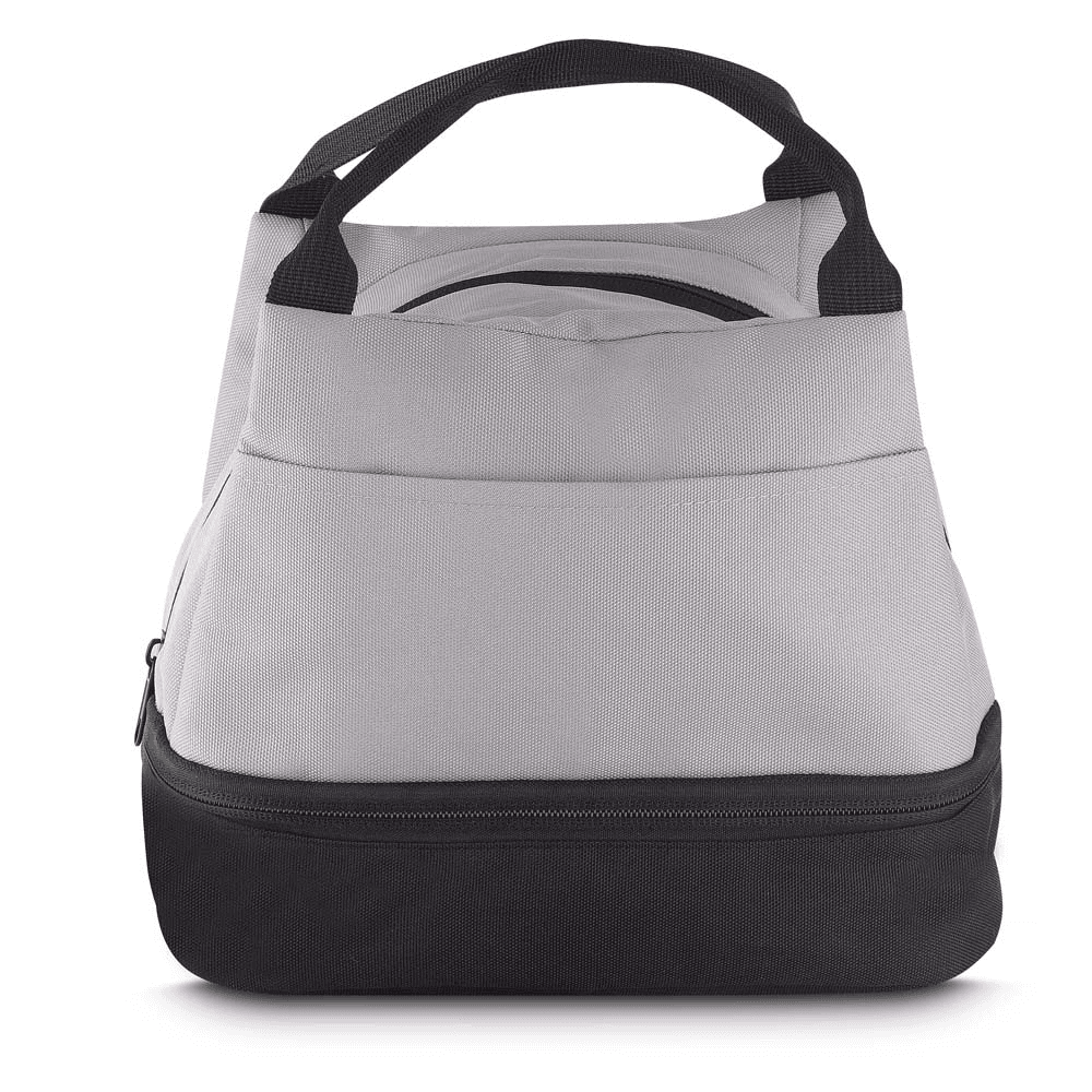 Bolsa térmica em tecido PET Reciclado com 2 compartimentos térmicos costurados, bolso frontal e alça de mão.