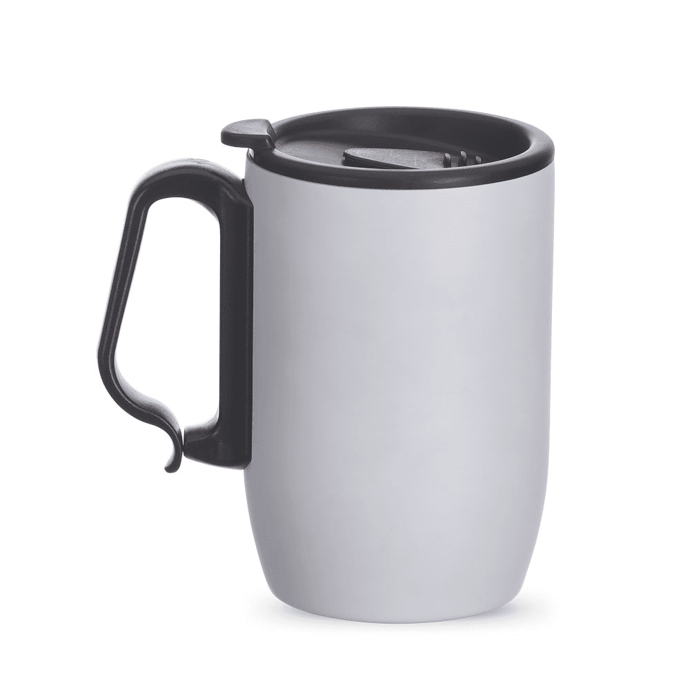 Caneca Térmica em aço inox de 350ml, alça de mão plástica tipo mosquetão, tampa com vedação e base de apoio em EVA.