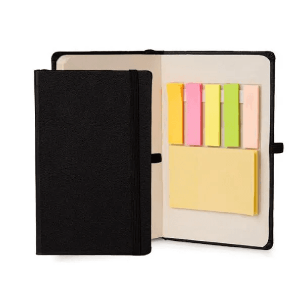 Caderno para anotações com capa dura. Conta com 80 folhas não pautadas, elástico para fechamento e 150 folhas autocolantes em 5 cores. Gramatura da folha de 70 g/m2