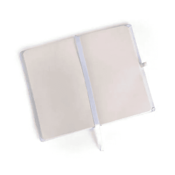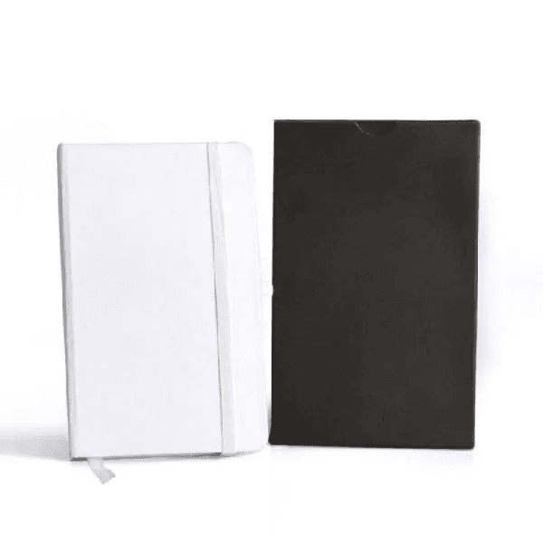 Caderno para anotações branco com capa dura. Conta com 80 folhas não pautadas, marcador de página, porta caneta e elástico para fechamento. Gramatura da folha de 70 g/m2.