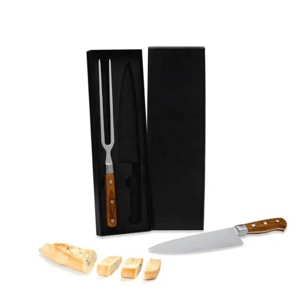 Conjunto para Churrasco. Composto por tábua em Bambu para Churrasco; faca e garfo premium em Madeira / Inox. Conta também com avental Gourmet em Brim preto.
