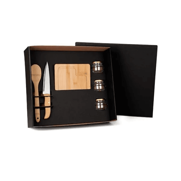 Kit para cozinha e tempero. Conjunto composto por uma tábua e colher 30 cm em bambu; Uma faca 7” em aço inox/bambu e 3 potinhos de vidro com tampa.