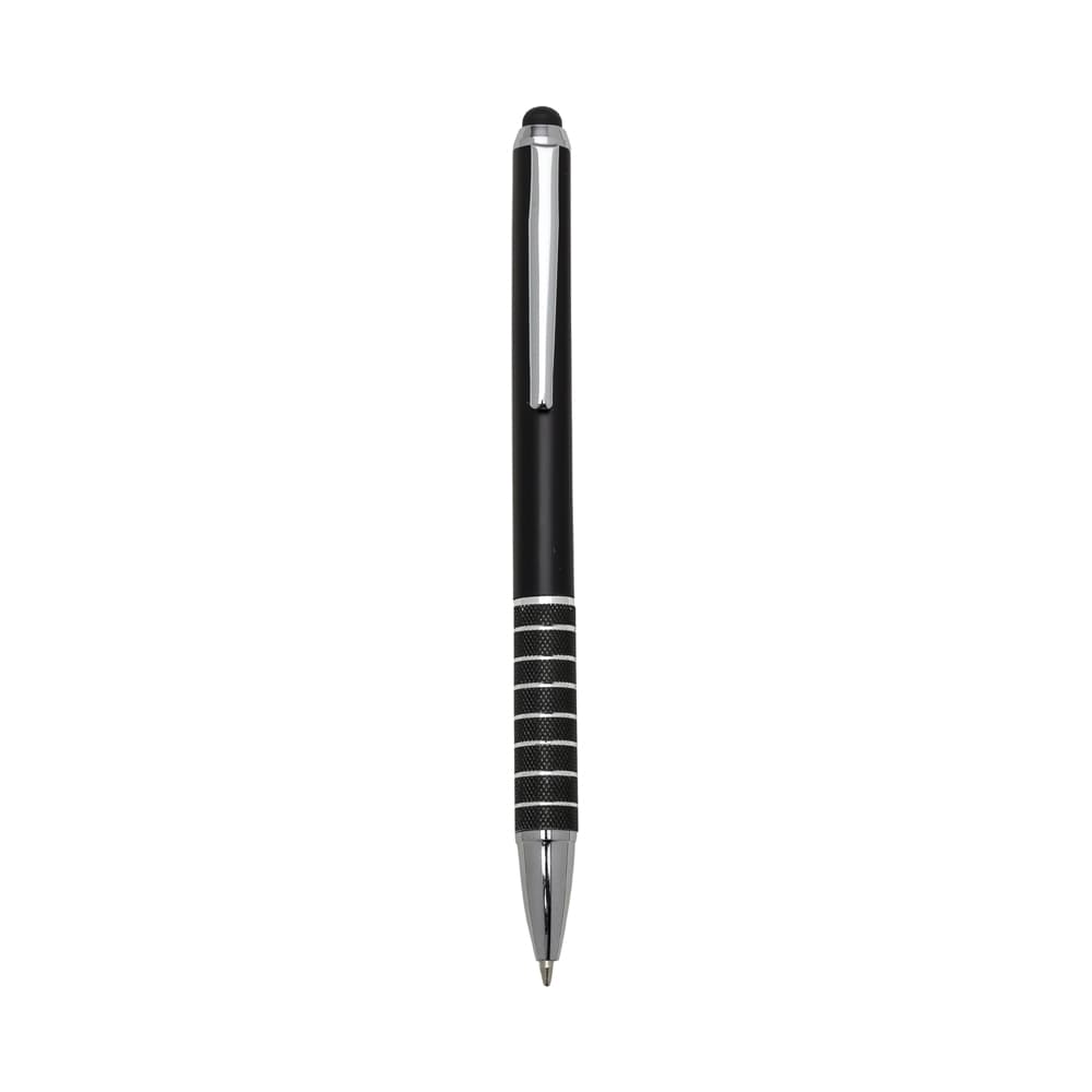 Caneta plástica com touch screen, carga esferográfica azul 1.0 mm e acionamento por rotação.