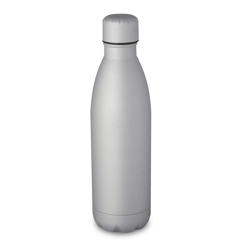 Garrafa fosca em aço inox com capacidade de até 750 ml. Tampa rosqueável e anel de silicone para vedação. Design com frisos na tampa.