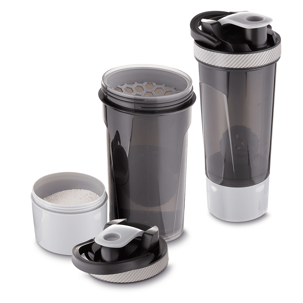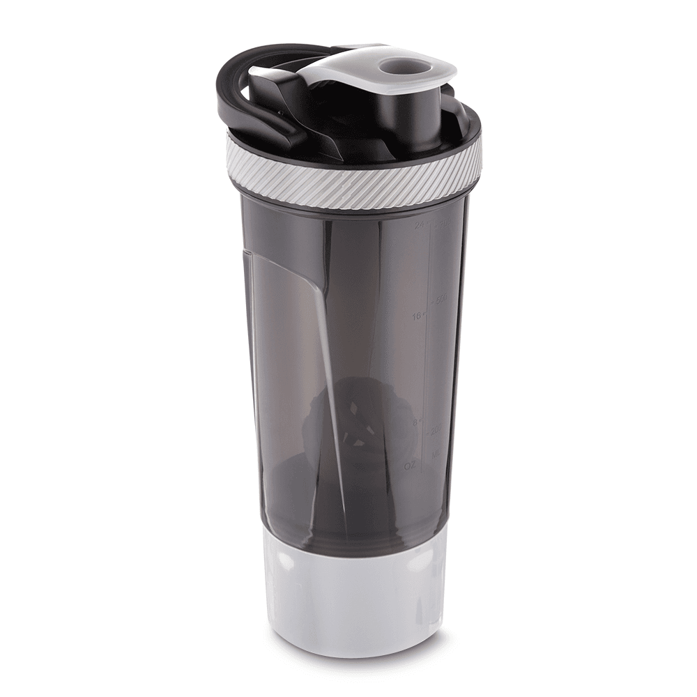 Garrafa coqueteleira plástica com capacidade de até 720ml. Com copo integrado na parte inferior da garrafa, possui misturador e peneira. Tampa rosqueável com anel de silicone para vedação, conta com uma alça de mão para transporte e bico com tampa para melhor segurança. Plástico Utilizado PP (polipropileno).