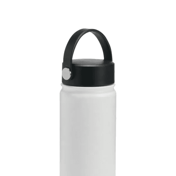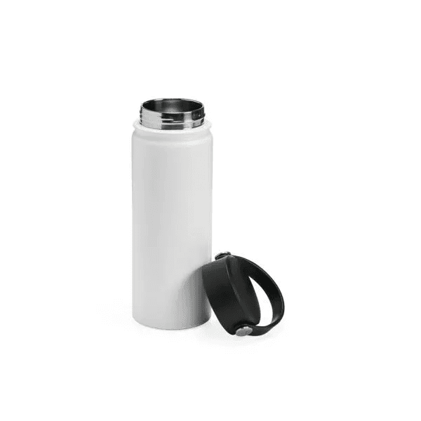 Garrafa em Inox na cor branca, confeccionada com dupla camada. Conta com tampa plástica rosqueável e alça de mão. Mantém a temperatura da bebida por mais tempo.
