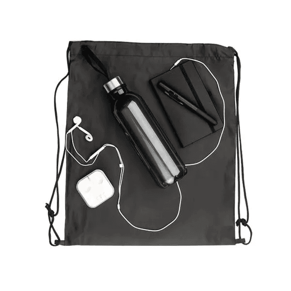Kit boas vindas. Conta com mochila em nylon 420, garrafa pet, fone de ouvido, caderno sem pauta e caneta esferográfica com tampa e ponta touch.