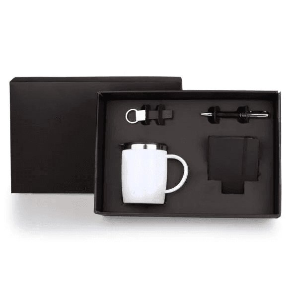 Kit composto por caneca em aço inox com revestimento de Poliestireno branco; chaveiro em metal e material sintético preto; caderno para anotações preto com capa dura e caneta confeccionada em metal cromado brilhante com corpo revestido em material sintético preto texturizado.