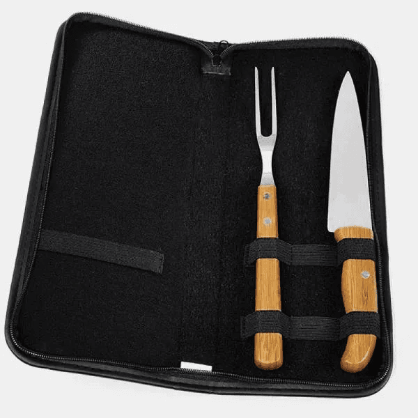 Kit Garfo, Faca Inox/Bambu Com Estojo E Avental - 4 Pçs PB-11113
