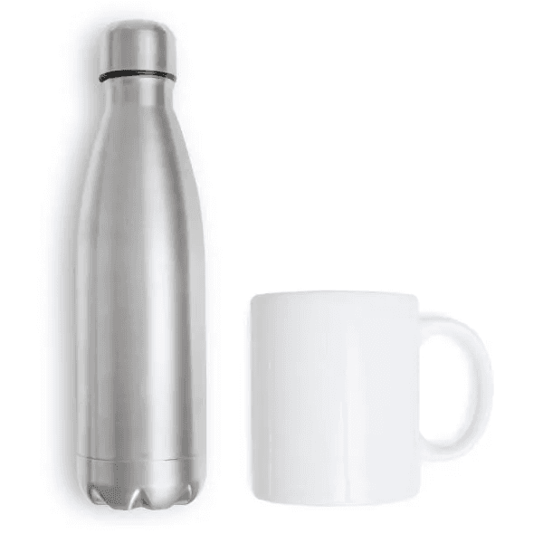 Kit garrafa e caneca. Composto por garrafa em aço Inox prata com tampa rosqueável e caneca em cerâmica branca.